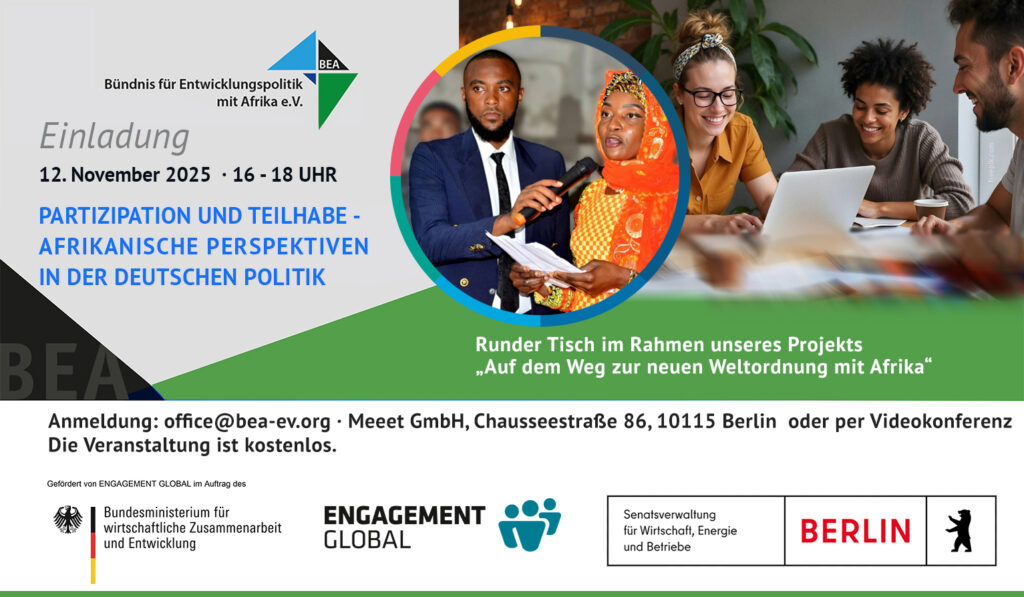 Wir laden Sie herzlich ein, am Runden Tisch von BEA e.V. zum Thema „Partizipation und Teilhabe – Afrikanische Perspektiven in der deutschen Politik“ teilzunehmen. Diese Veranstaltung ist Teil unseres Projekts „Auf dem Weg zur neuen Weltordnung mit Afrika“ zur Sichtbarmachung und Stärkung afrikanischer Perspektiven auf internationale Machtverhältnisse, gefördert von Engagement Global aus Mitteln des Bundesministeriums für wirtschaftliche Zusammenarbeit und Entwicklung (BMZ). In dieser Veranstaltung möchten wir nach den Teilhabemöglichkeiten und Perspektiven für Menschen mit (familiärer) Migrationsgeschichte in der deutschen Politik fragen. Angesprochen sind auch Engagierte in politischen Jugendorganisationen, die sich entwicklungspolitisch für internationale Solidarität, wirtschaftliche Zusammenarbeit, Stärkung von Rechtsstaatlichkeit sowie für Menschen- und individuelle Freiheitrechte engagieren möchten.